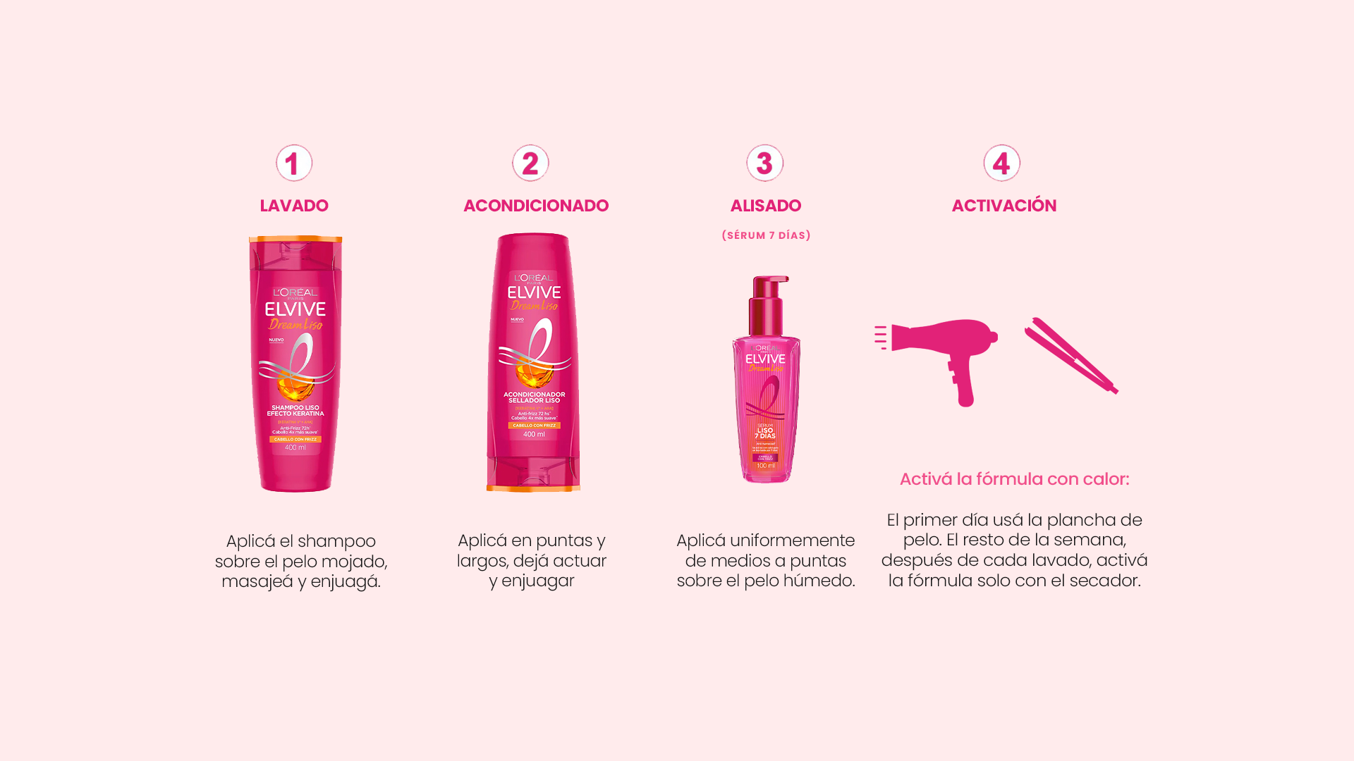 Enfatizá los beneficios del Sérum: efecto lacio por 7 días, sin frizz, protección térmica y que se activa con calor.